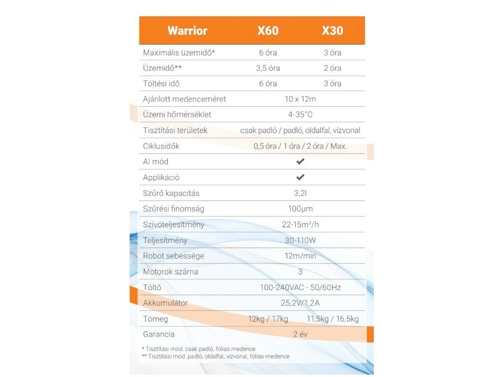 Na rozdiel od iných robotov Warrior reguluje svoj výkon tak, aby šetril energiou pri dosiahnutí až 6 hodín prevádzky, vďaka čomu udrží bazén čistý až 2 týždne na jedno nabitie.